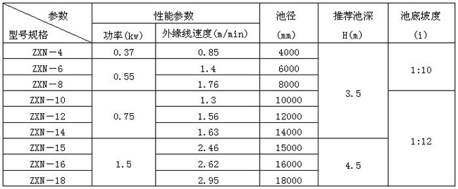 ZXN型中心传动浓缩机采用蜗轮蜗杆传动(D<8m可采用摆线针轮减速机,D>14m采用中心回转齿轮),刮泥板外缘线速度≤3m/min,整个刮泥机构可以手动调节提升(用摆线针轮减速机不可以提升)。